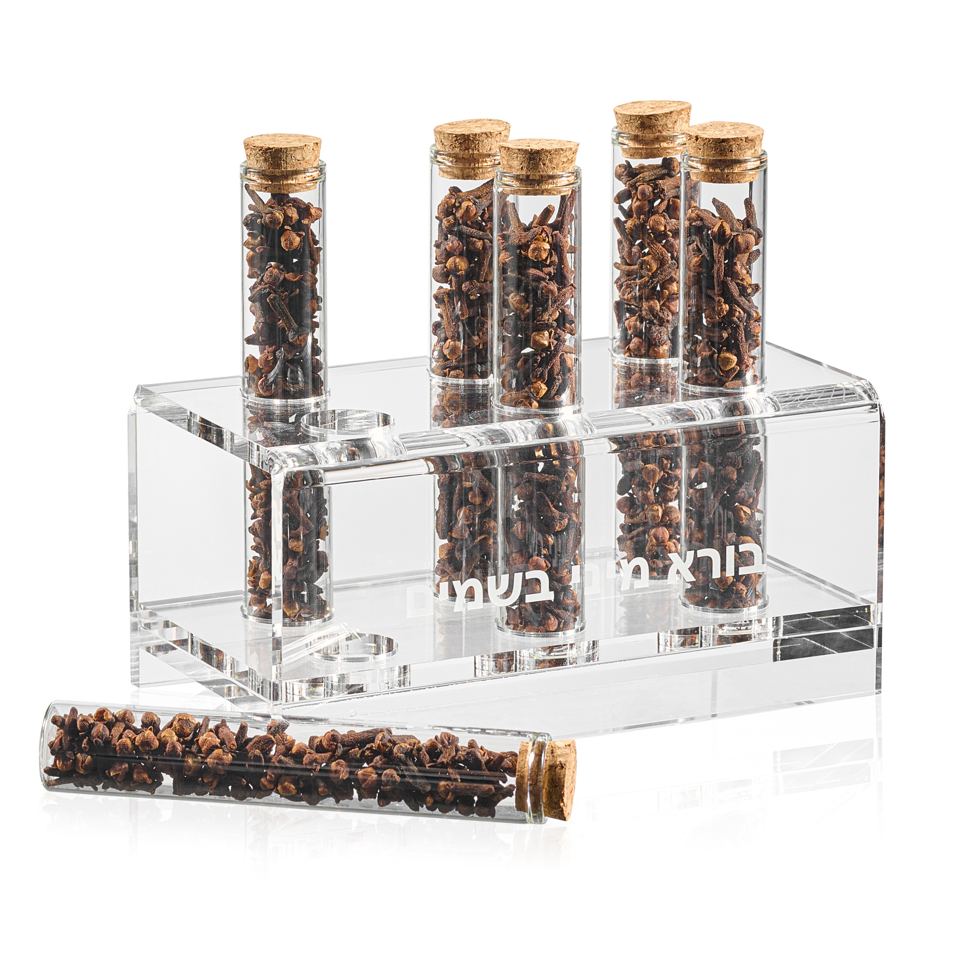 Glass Spice Vials (Six): A clear, seamless acrylic stand holds six cork-sealed vials for besamim.