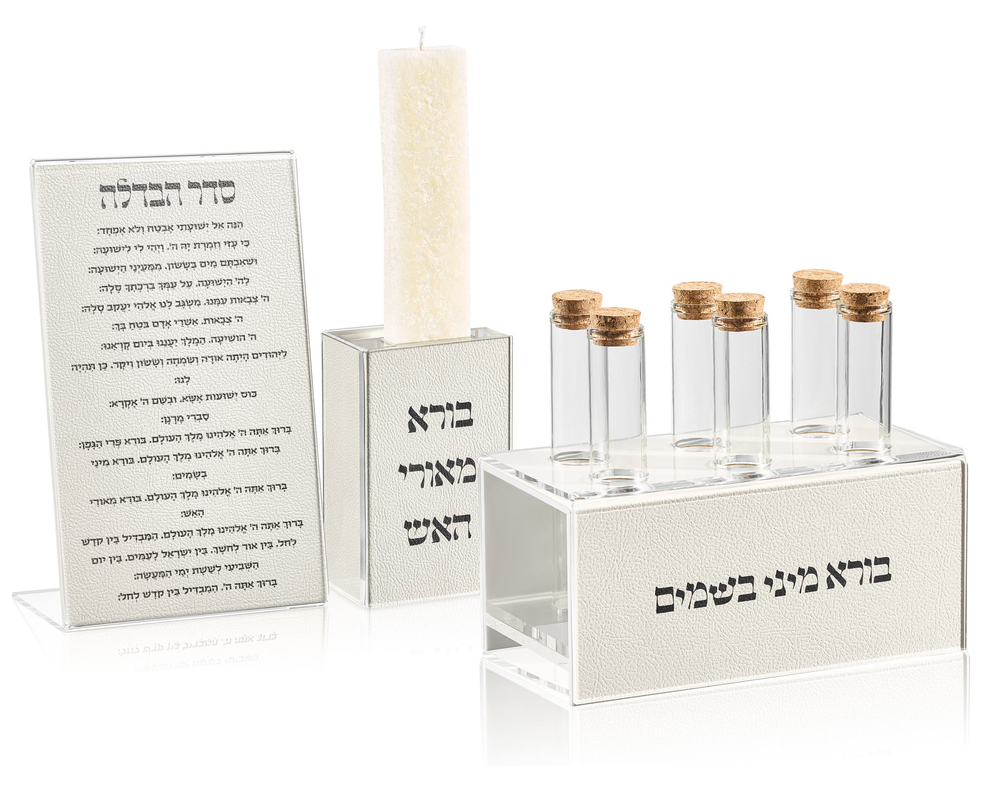 A modern, architectural take on the Havdalah ritual. This clear acrylic design features striking metallic posts, six glass spice vials, and a clean Seder Havdalah plaque, offering a bold, contemporary way to honor tradition.